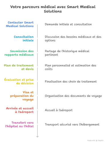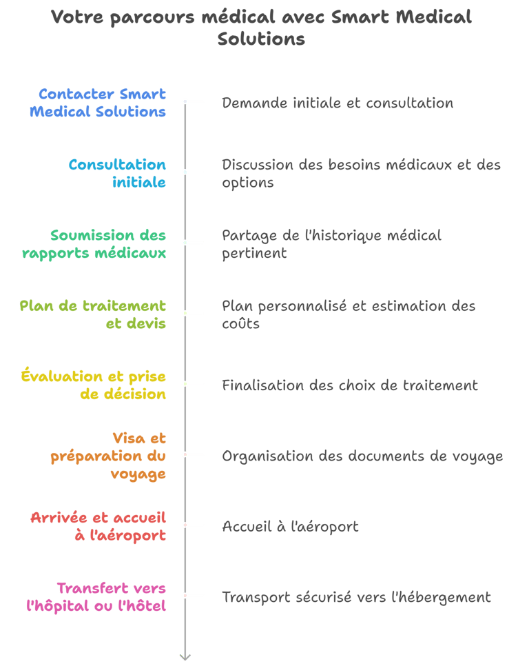 Chez Smart Medical Solutions, nous collaborons avec nos partenaires médicaux à l'étranger pour vous fournir un devis détaillé de votre traitement. Mais nous allons plus loin: nous élaborons également un budget global pour l'intégralité de votre voyage médical. Ce budget comprend non seulement les frais de traitements, mais aussi les coûts annexes essentiels tels que l'hébergement, le billet d'avion, les frais de visa, nutrition etc... Notre objectif est de vous offrir une estimation financière complète et précise, vous permettant ainsi de planifier votre séjour en toute sérénité.